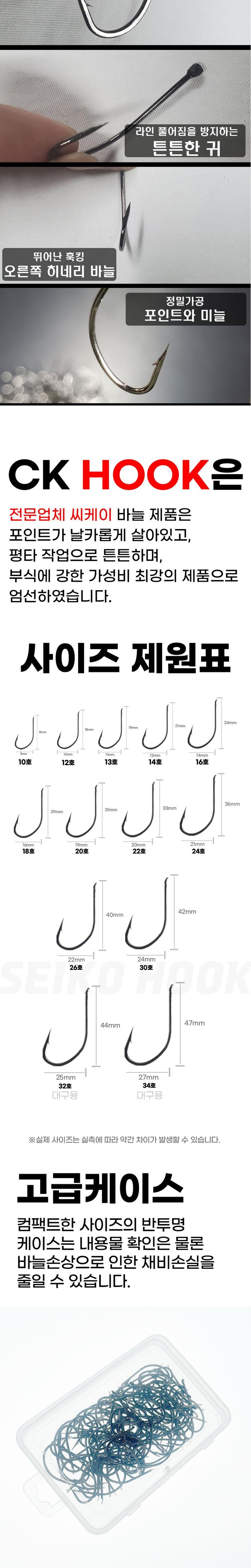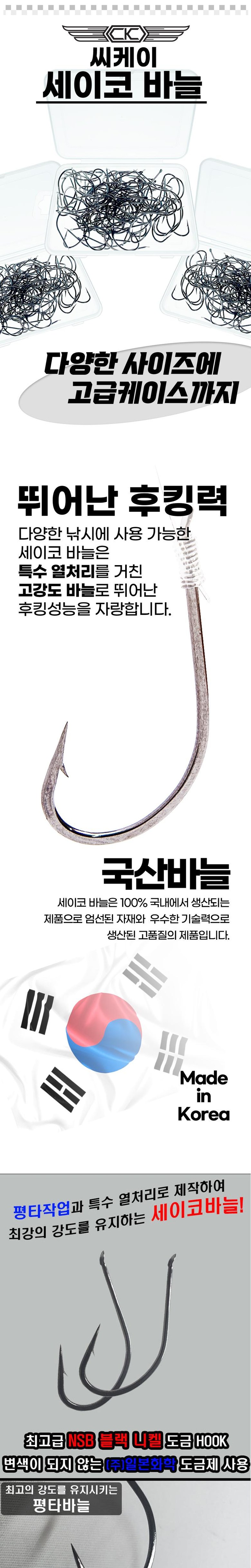 | 품명 및 모델명 | 씨케이 / 국산 – 세이코 바늘 / 10호~34호 / 다양한 선택 홋수 / 원투, 우럭, 대구 등 |