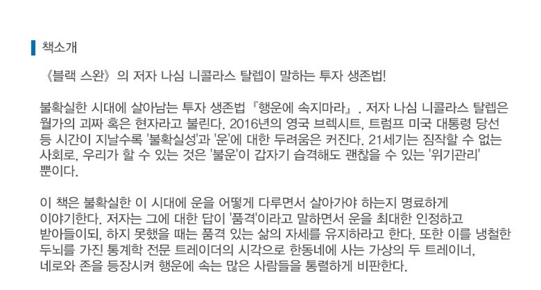 | 목차 또는 책소개(아동용 학습 교재의 경우 사용연령을 포함) | 《블랙 스완》의 저자 나심 니콜라스 탈렙이 말하는 투자 생존법!